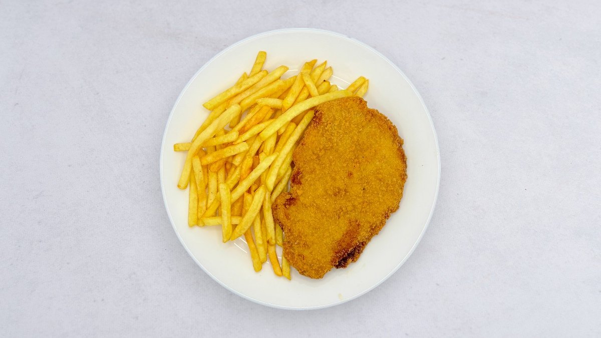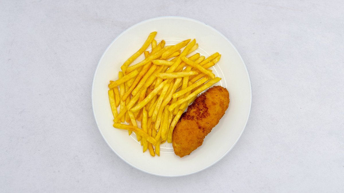 Kotlet devolay z serem i frytkami, sałatką z marchewką