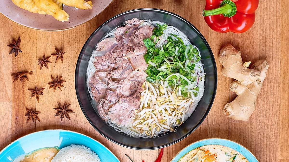Tradycyjna zupa pho z delikatnie smażoną wołowiną. Idealne połączenie smaków z Wietnamu.