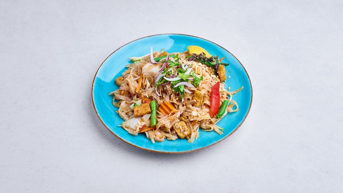 Smakowity pad thai z tofu i mieszanką świeżych warzyw: kapusty pekińskiej, szczypiorku, marchwi, kiełków i fasolki. Wegetariański i zdrowy wybór!