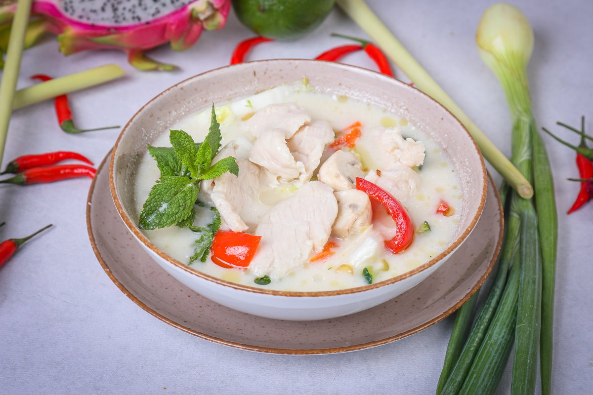 Uwielbiane danie z kuchni tajskiej - Tom Kha z kurczakiem. Bogate w smaku, z nutą kokosa, kurczaka, trawy cytrynowej i chili.