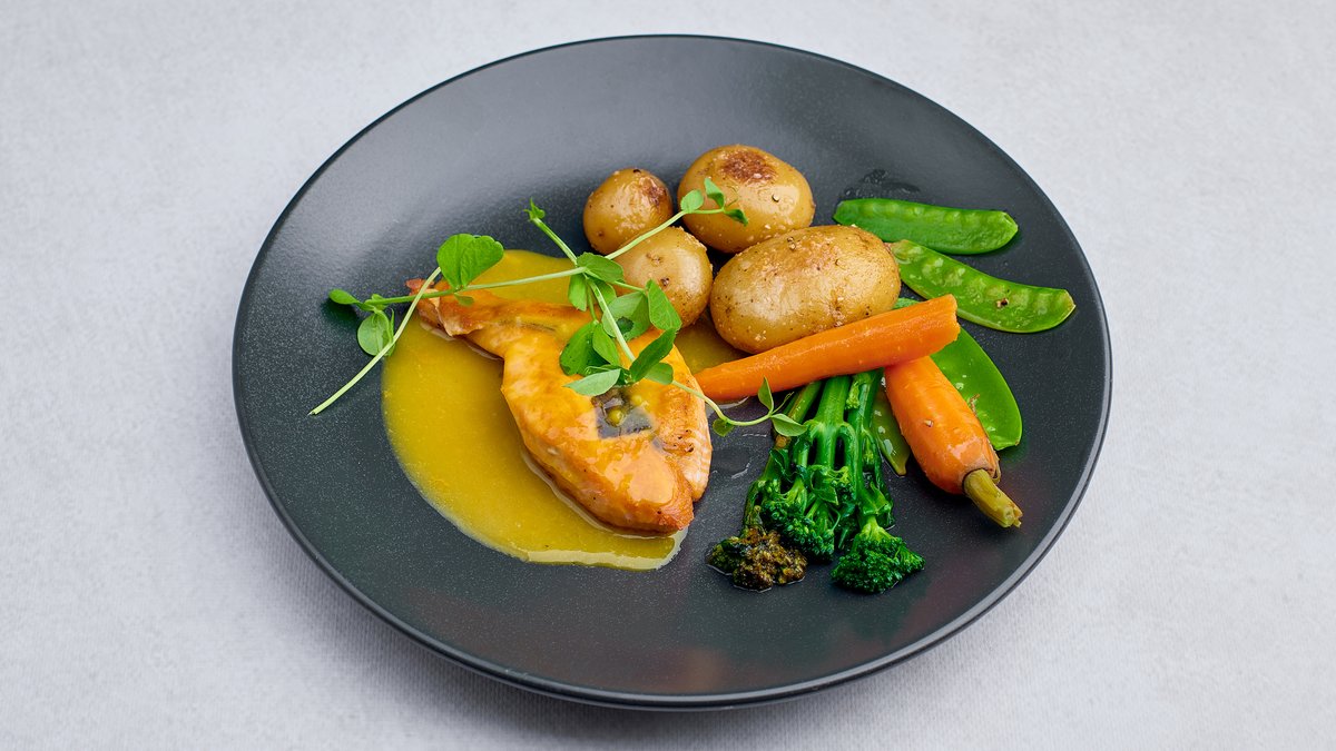 Łosoś z pieca z ziemniakami francuskimi, cukrowymi warzywami i sosem szafranowym