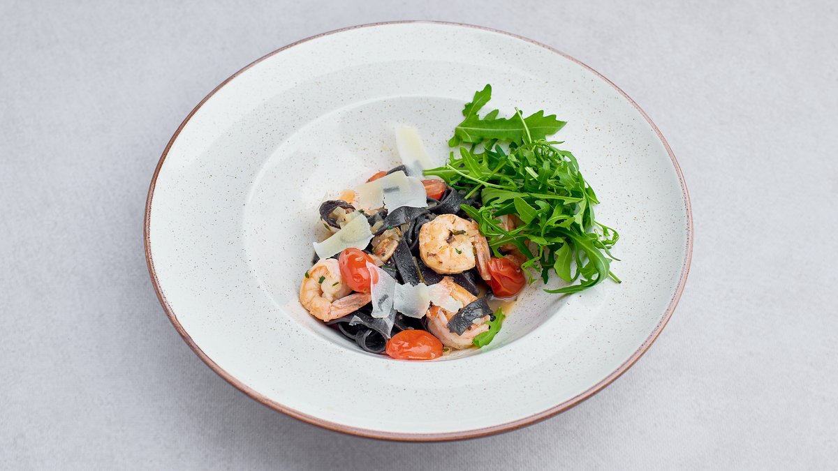 Tagliatelle z krewetkami, pomidorami cherry,czosnkiem i sosem winno-maślanym