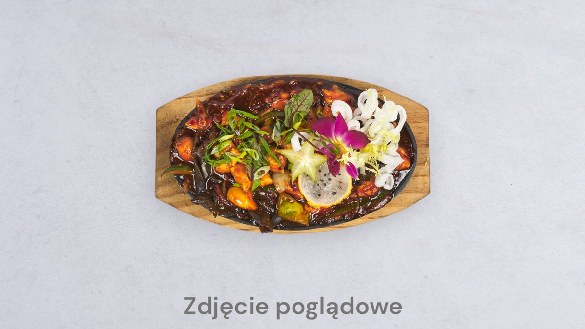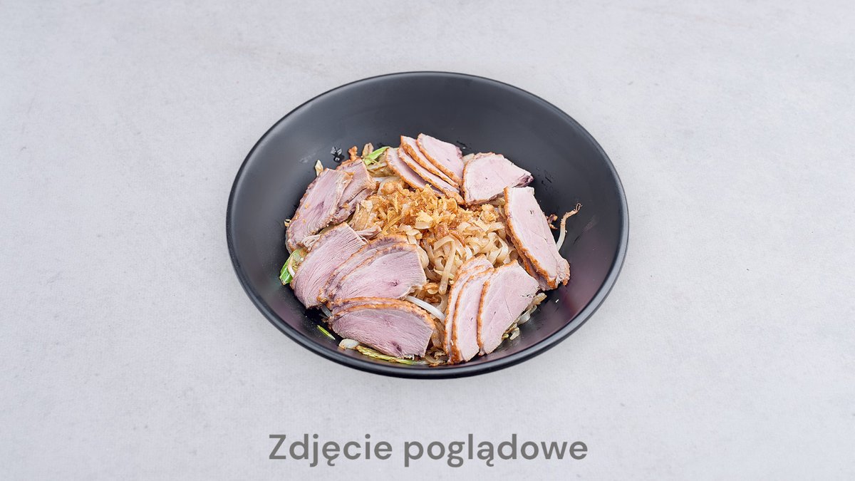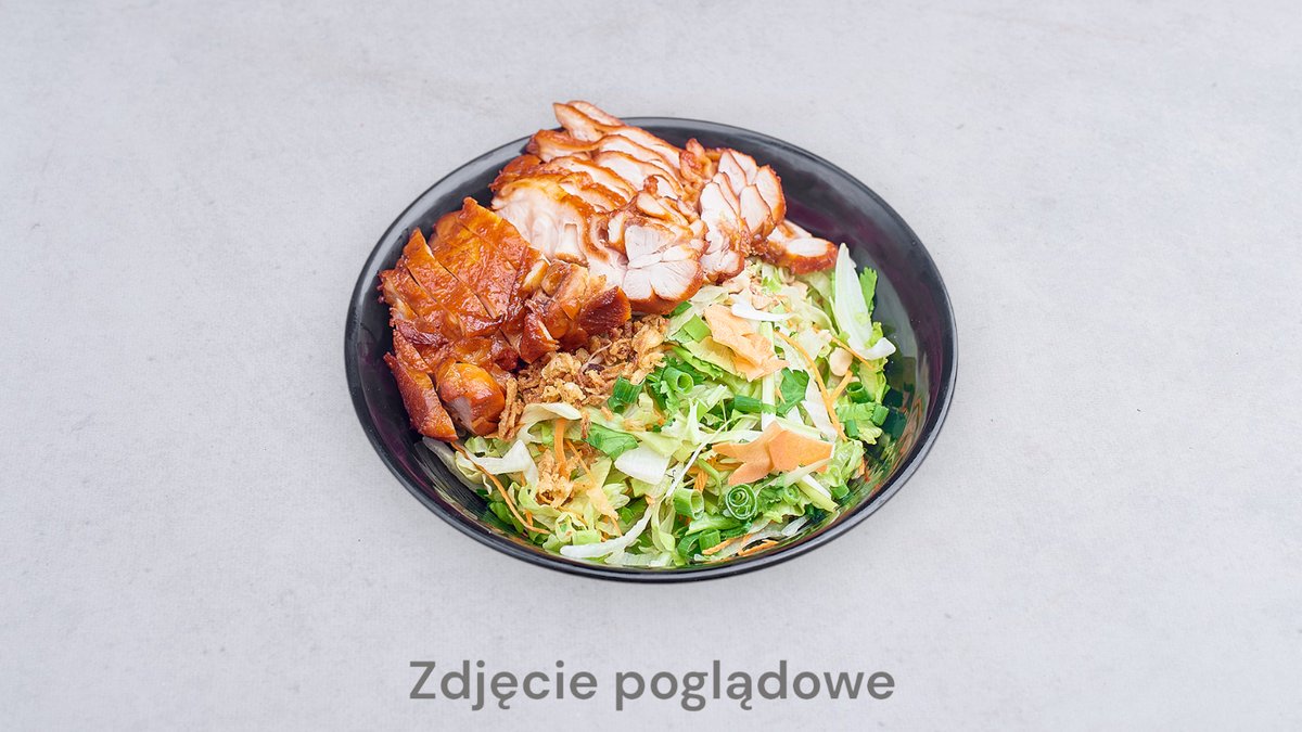 Kaczka, makaron ryżowy, cebula prażona, sałatka, sos czosnkowo-słodko kwasny, danie letnie
