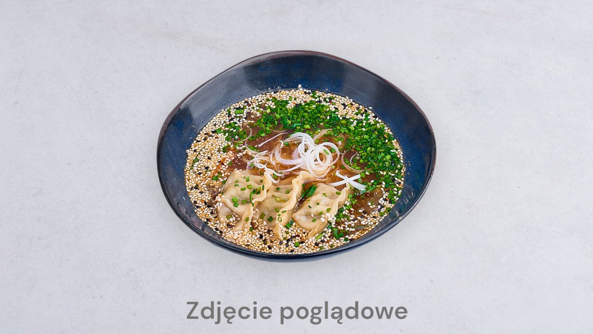 Z pierożkami wieprzowo-wołowymi, pierożkami krewetkowymi, krewetkami i makaronem sojowym