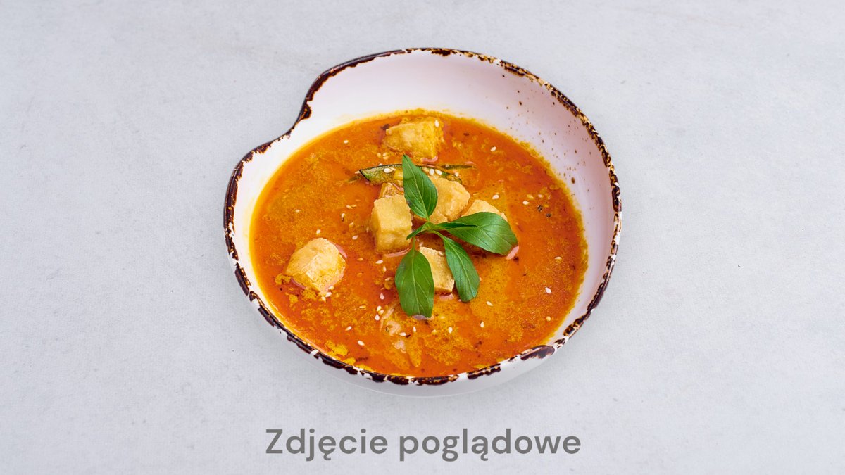 Poziom ostrości 2, duże krewetki w sosie curry, z dodatkiem warzyw, podawany z ryżem, porcją surówek