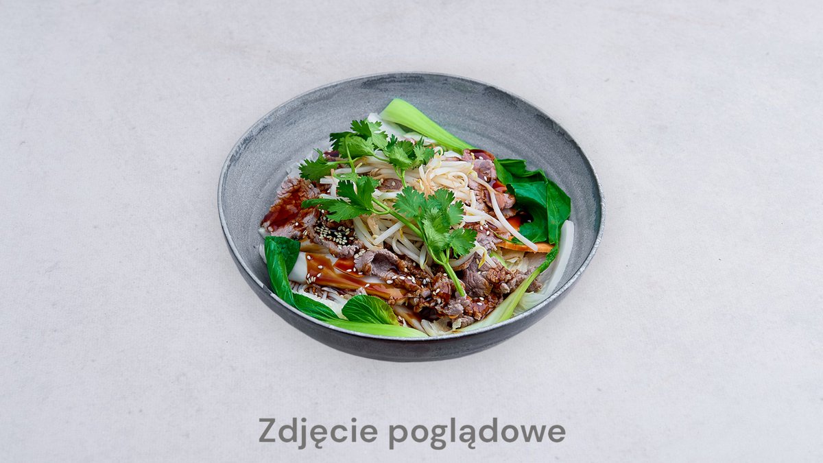 Makaron ryżowy, wołowina smażona, cebula prażona, sałatka, sos czosnkowo-słodko kwasny, danie letnie