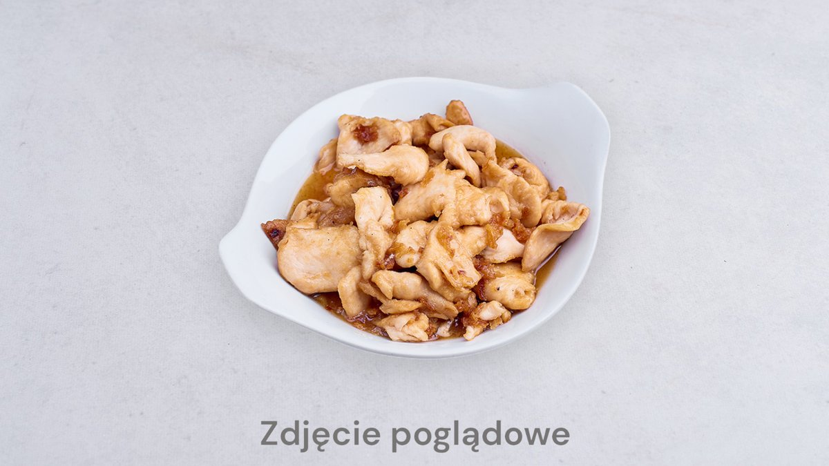 Makaron ryzowy, udko kurczaka, cebula prażona, sałatka, sos czosnkowo-słodko kwaśny, danie letnie