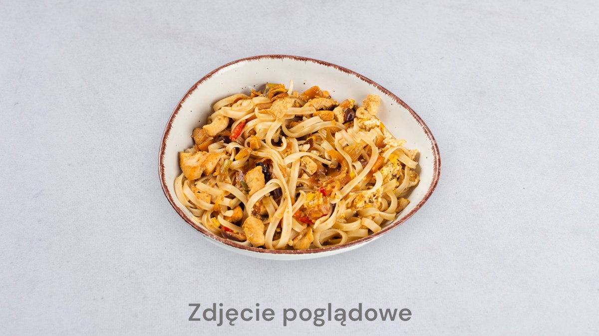 Makaron ryżowy smażony z kawałkami fileta kurczaka, marchewkami, brokułami, porem i cukinią