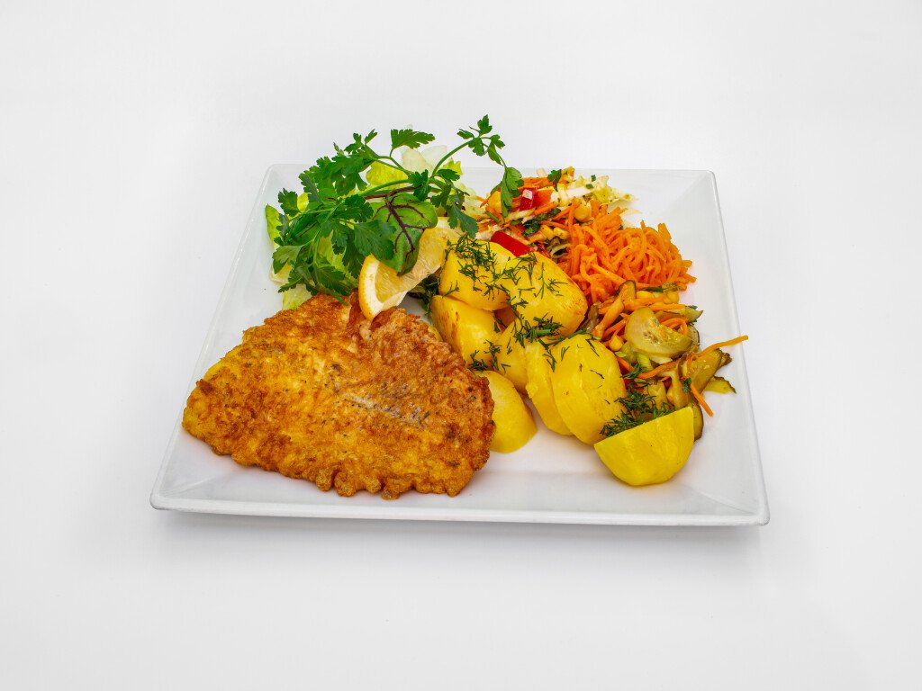 200 g Filet białej ryby z patelni podany z frytkami belgijskimi i zestawem surówek