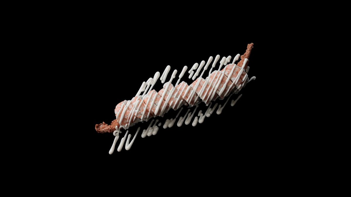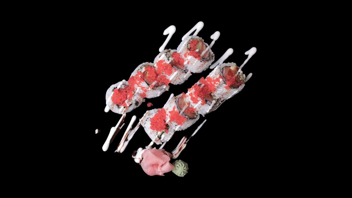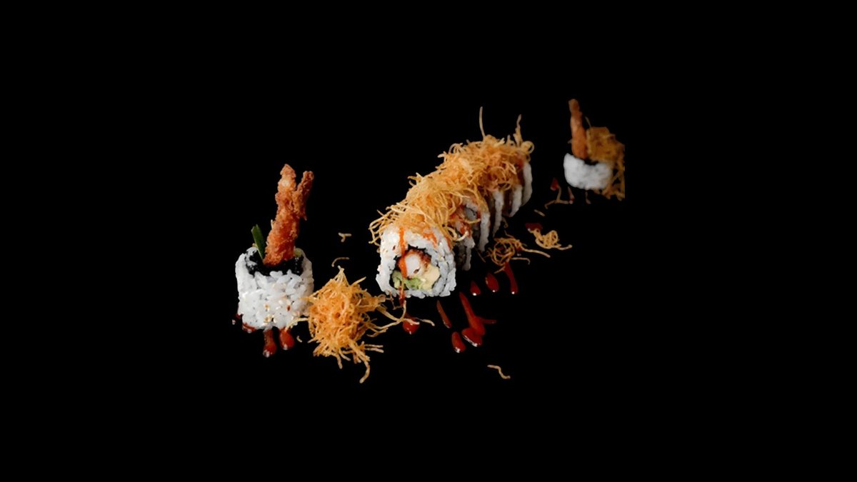 Krewetki w tempurze, awokado, ogórek, rolka przykryta mixem surimi z pikantnym sosem