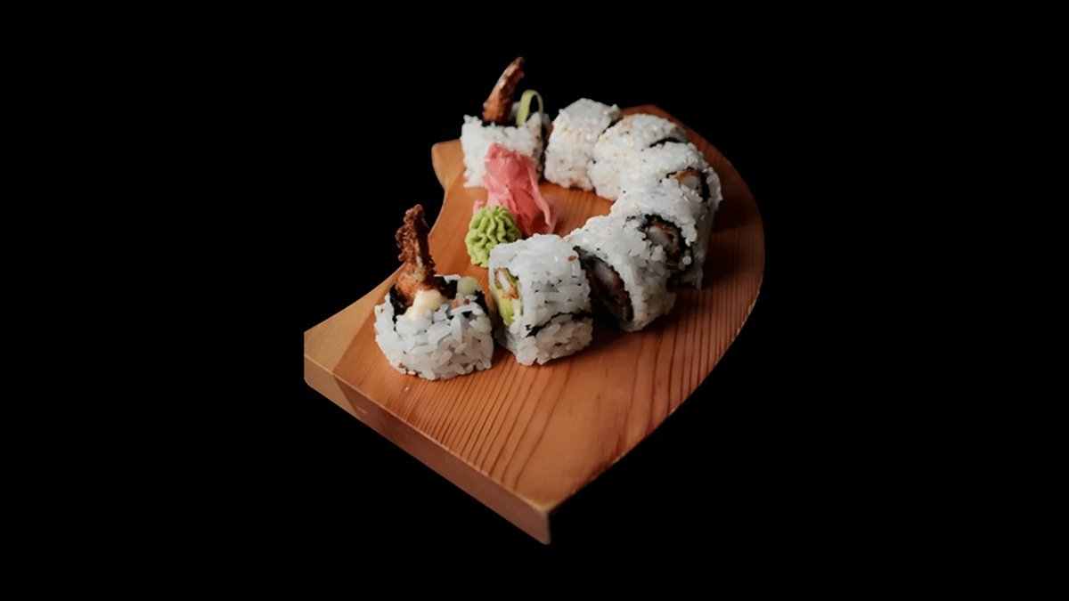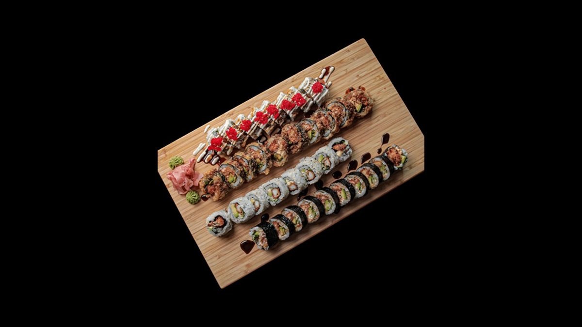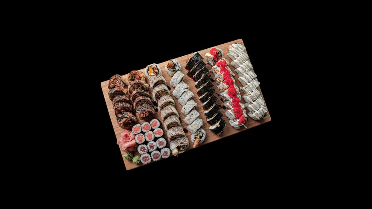64 szt. 8x Ebi tempura maki, 8x philadelphia salmon roll, 6x sake maki, 6x tekka maki, 8x unagi tempura roll, 8x california salmon roll, 10x double tempura sake, 10x tempura sake maki