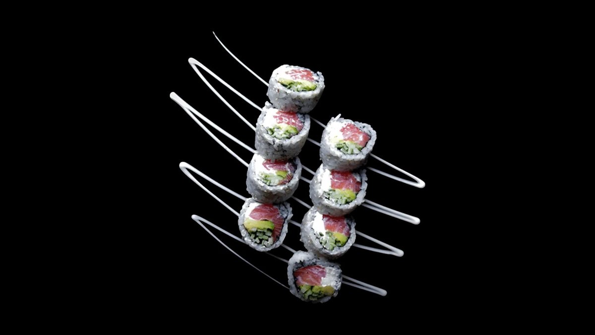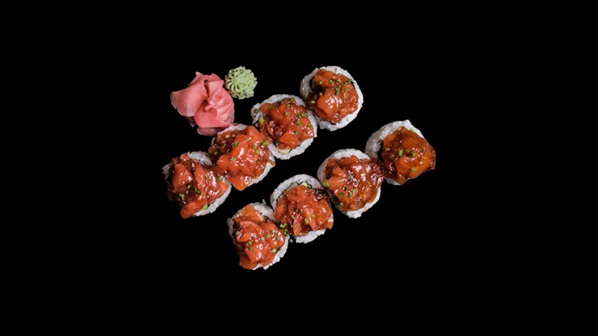 Surimi, awokado, ogórek, rolka przykryta tatarem z tuńczyka w pikantnym sosie