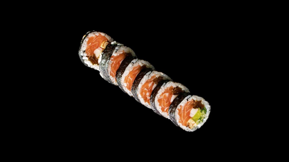 Serek philadelphia, awokado, ogórek, rolka przykryta plasterkami grillowanego łososia i parmezanem