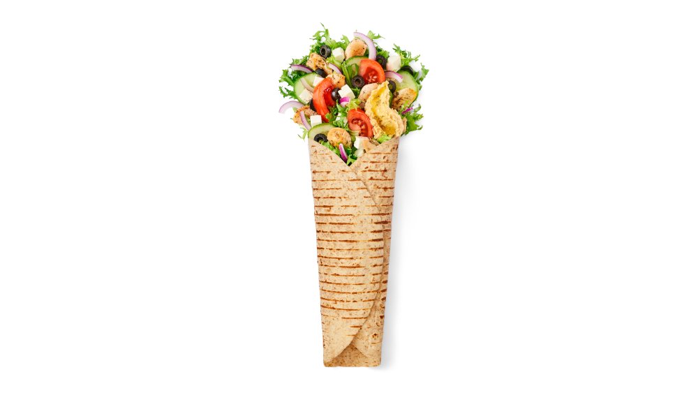 Mieszanka sałat, hummus klasyczny, cebula, kurczak w ziołach, ser typu feta, pomidor, ogórek świeży, oliwki, sos winegret