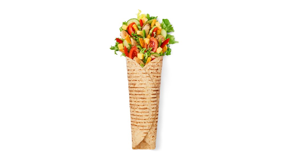 Mieszanka sałat, ananas, kurczak chilli, ser zółty, ogórek świeży, grzanki, pomidor cherry, kiełki słonecznika, sos winegret