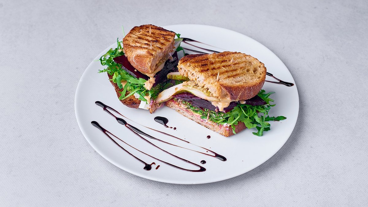 Kanapka BURAK SŁODKO-KWAŚNY feta, rukola, masło orzechowe, gruszka, awokado