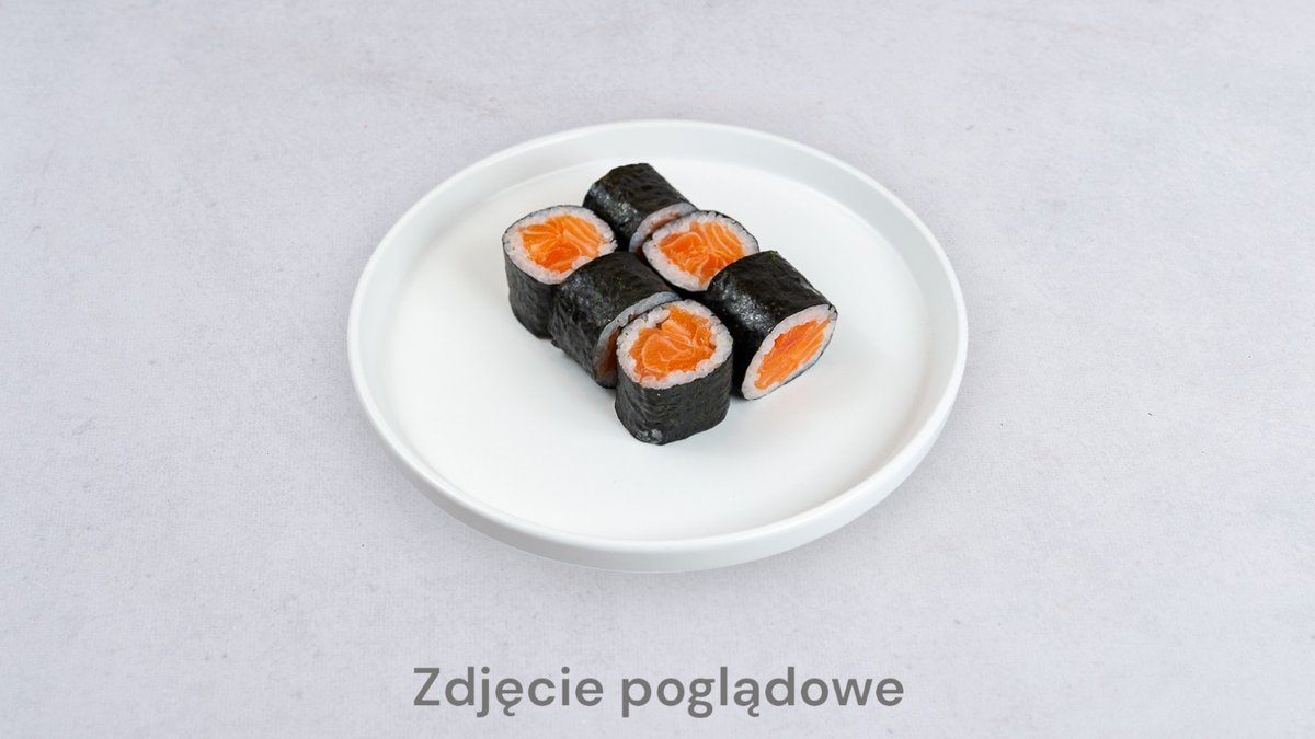 16 szt., 6 szt. futomaki łosoś, 8 szt. hosomaki łosoś, 2 szt. nigiri łosoś