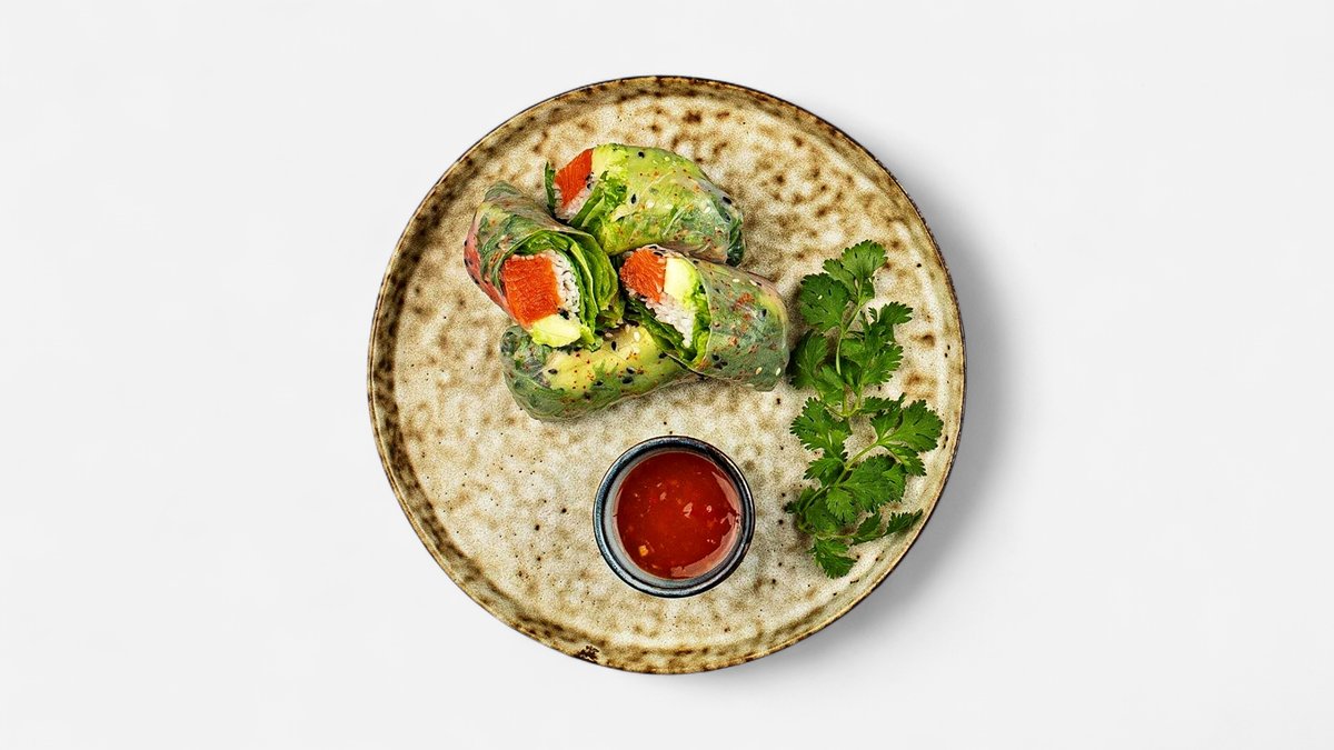 Papier ryżowy, łosoś, awokado, rzodkiew daikon, sałata frisée, kolendra, shichimi, sezam, słodki sos chili