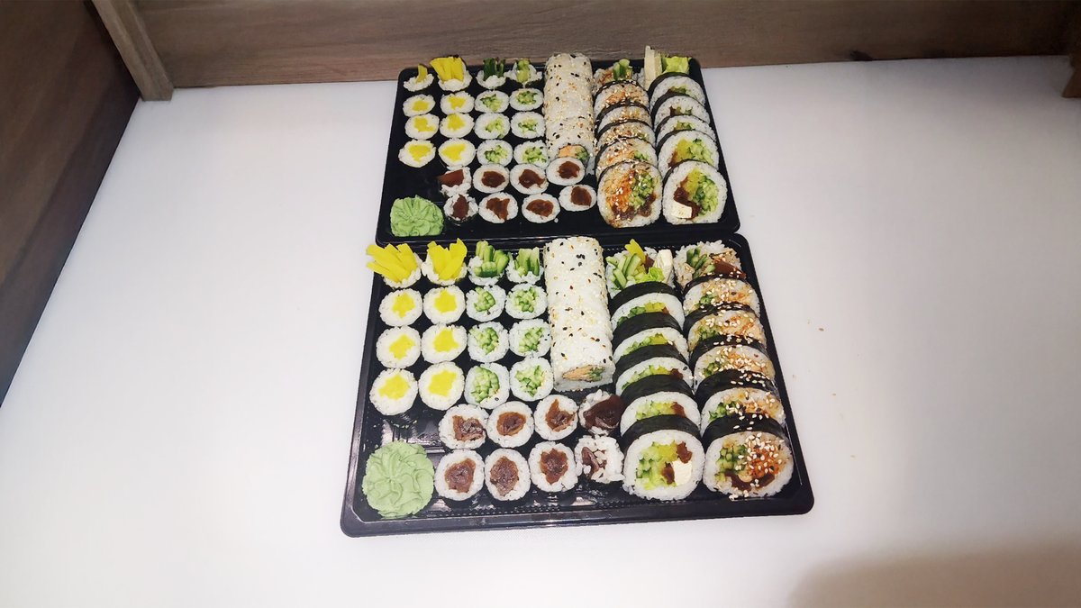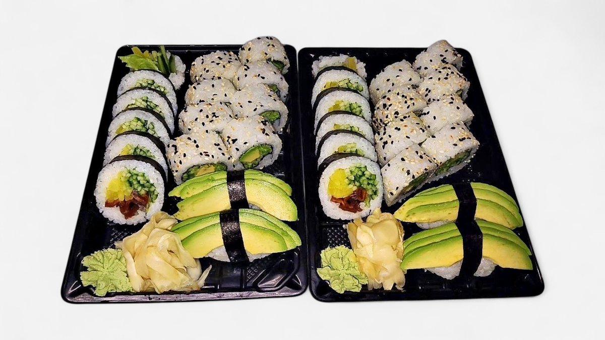 32 szt., 2x8 szt. uramaki vege, 2x6 szt. futomaki vege, 2x2 szt. nigiri awokado