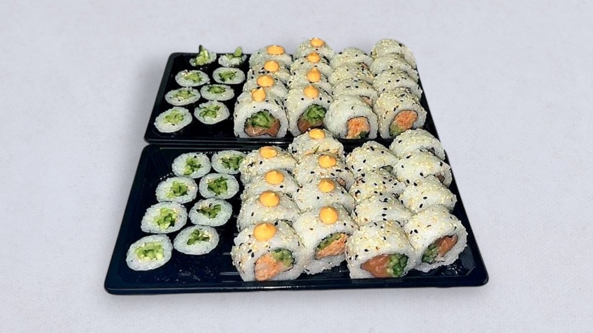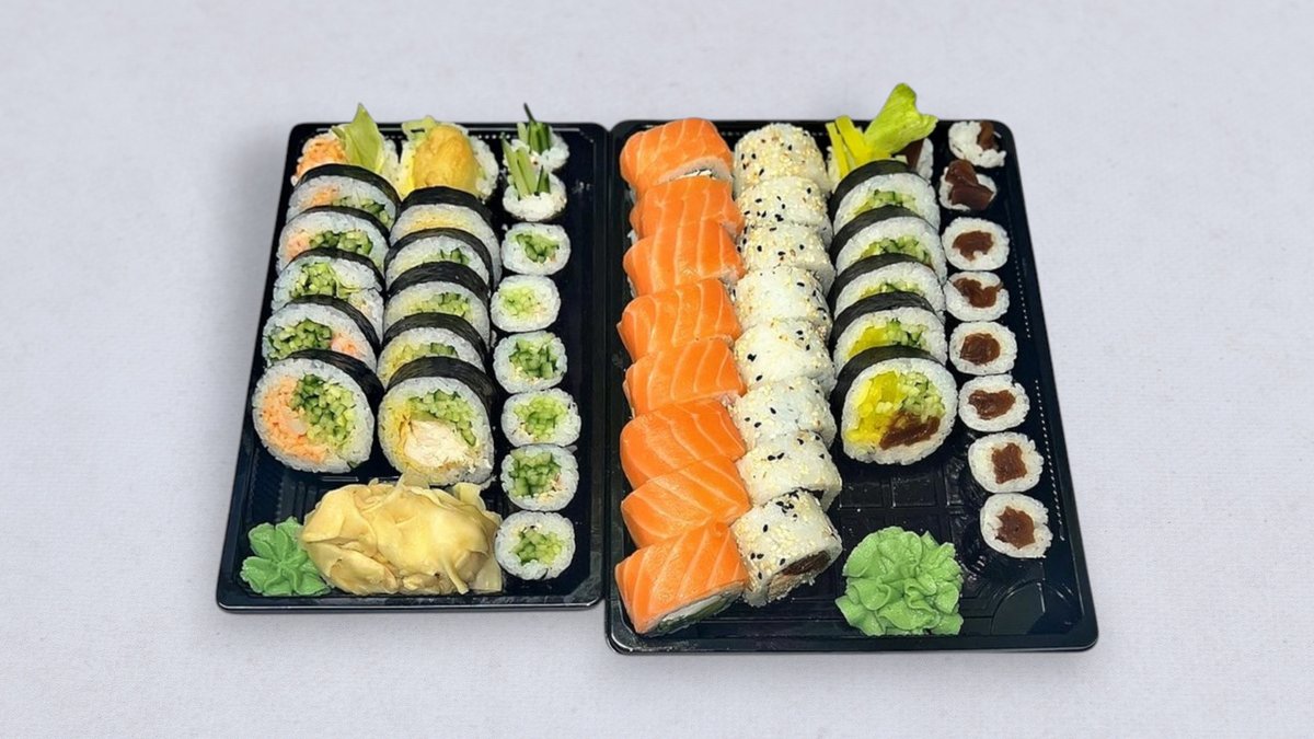 40 szt., 6 szt. futomaki pieczony łosoś, 6 szt. futomaki vege, 4 szt. uromaki surimi, 8 szt. hosomaki rzepa, 8 szt. hosomaki tykwa, 8 szt. hosomaki ogórek