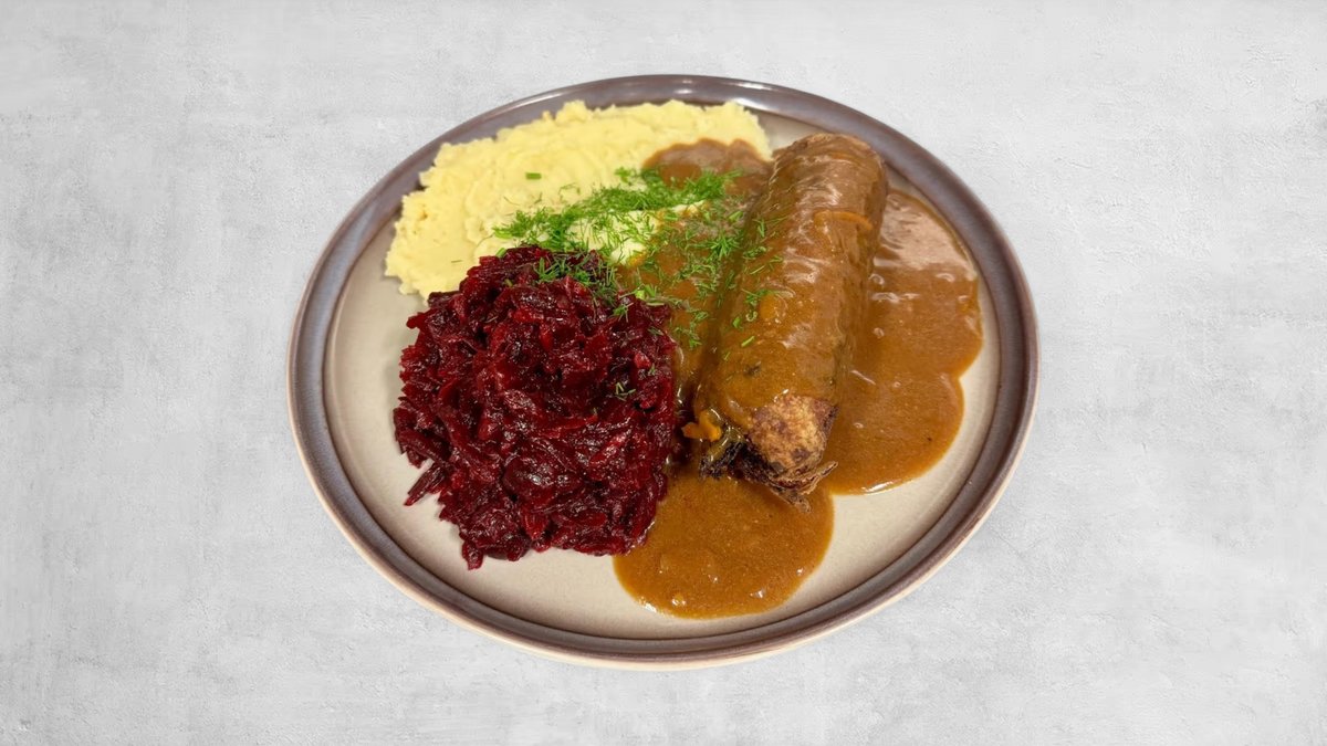 roladka sojowa z ogórkiem kiszonym, cebulą i musztardą w sosie własnym