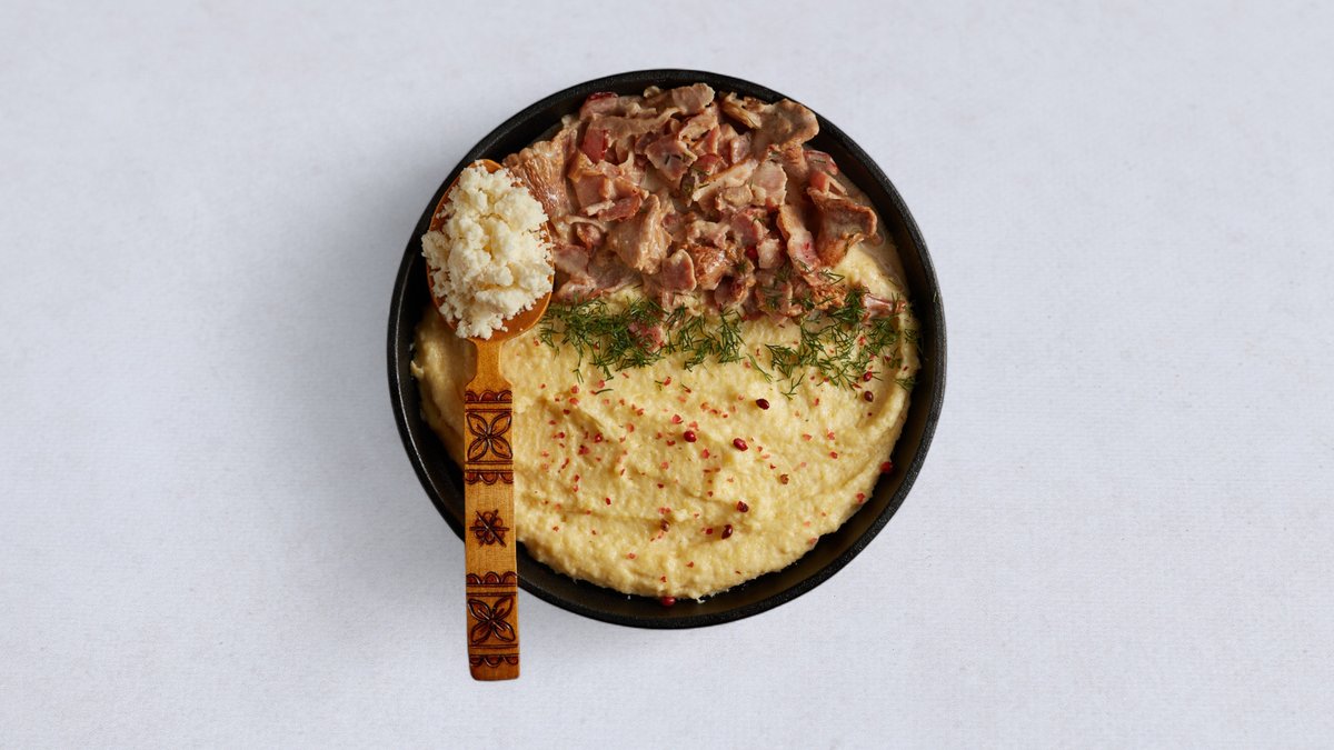 Kasza kukurydziana warzona w śmietance, podawana z bryndzą, skwarkami i kurkami