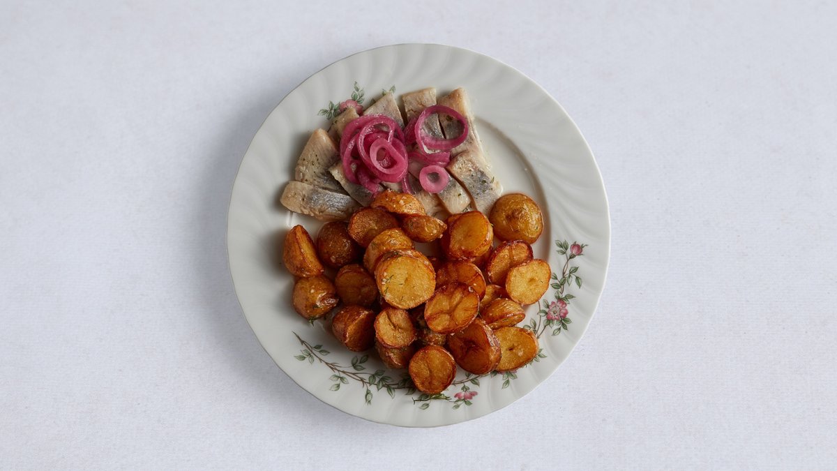 Śledź, ziemniaki smażone, cebula