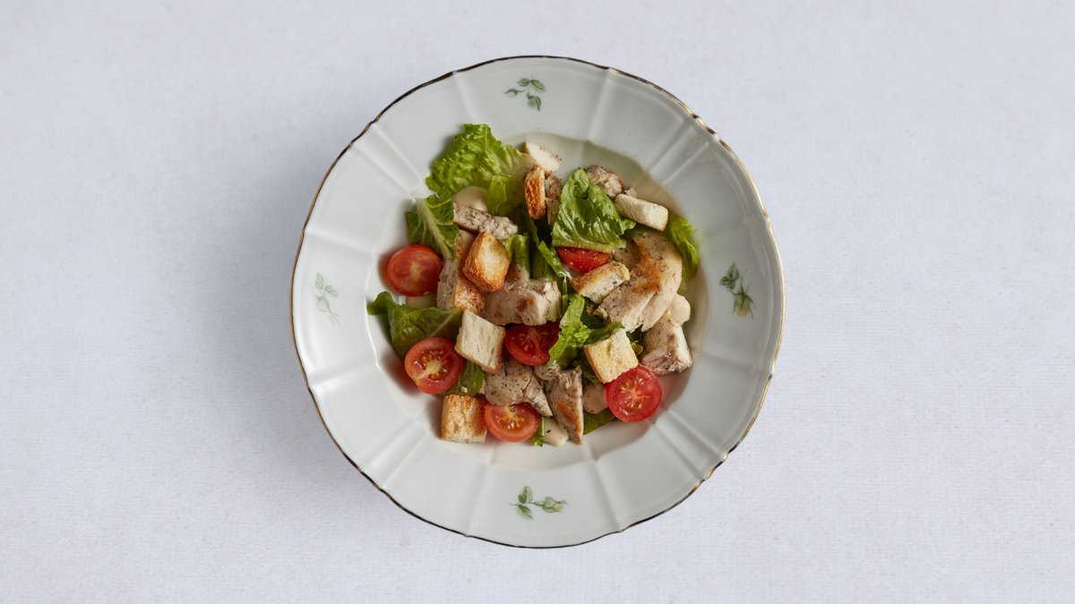 Pierś kurczaka, sałata rzymska, grzanki, pomidory cherry, sos cezar, parmezan