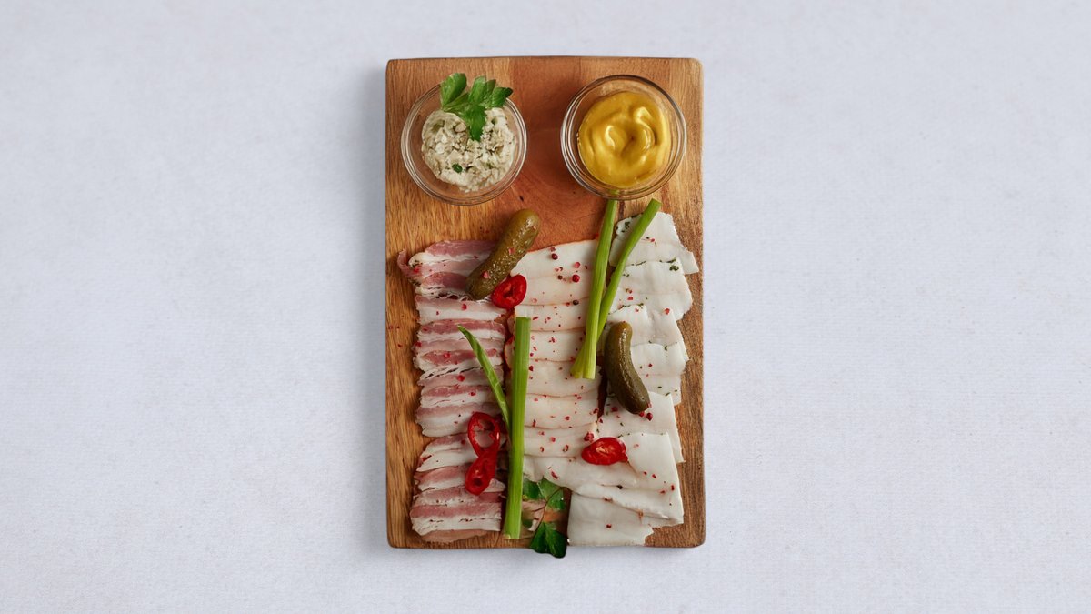 Trzy rodzaje słoniny, chrzan, musztarda, chleb litewski.