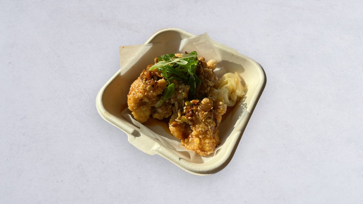 Soczyste udko kurczaka marynowane w imbirze, idealnie smażone na chrupko w stylu karaage, z kremowym japońskim majonezem, słodko-słonym sosem teriyaki i pikantnym olejem z chili