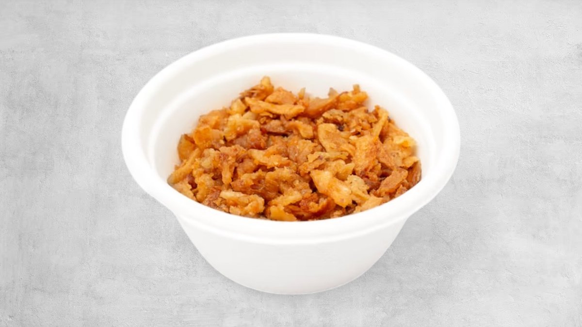 Ziemniaki, boczek wędzony. Okrasa smażona cebulka.