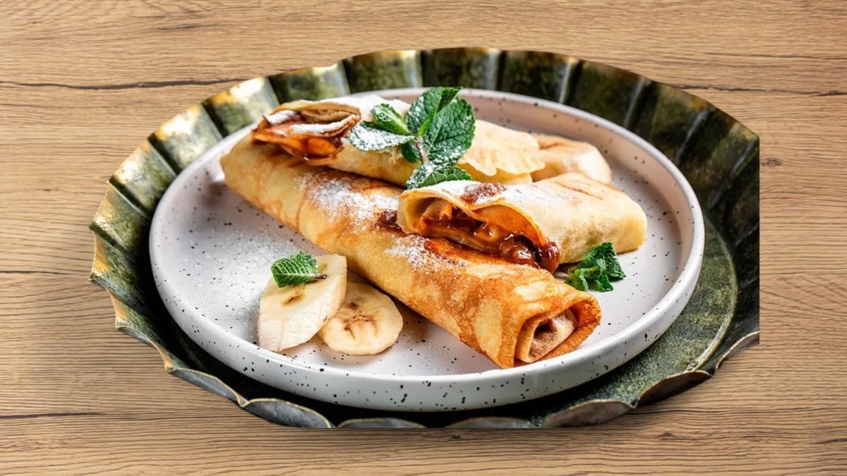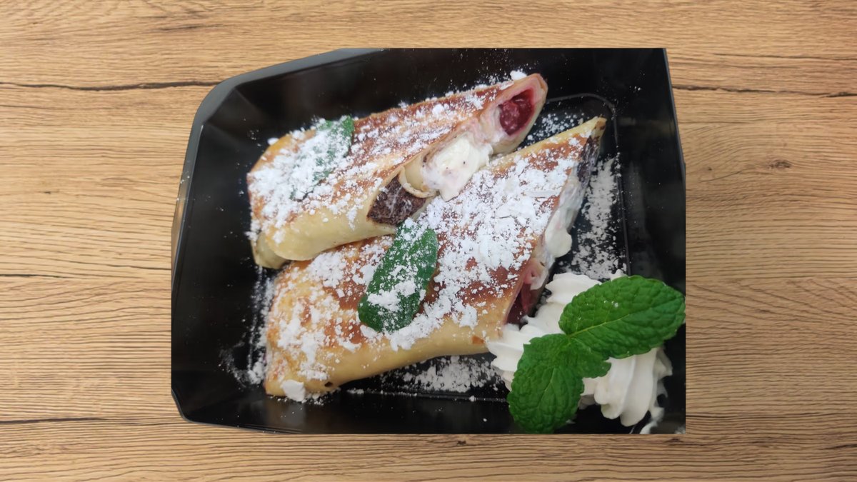 Porcja zawiera trzy naleśniki zakręconych w jeden, nadzienie z wiśni, masy makowej i twarożku. Podawane z okrasą, cukrem puderem i polewą czekoladową