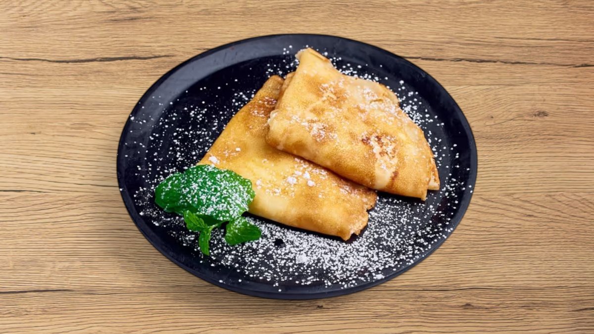 Porcja zawiera dwa naleśniki po 30 cm z białym makiem, mascarpone, okrasa, orzeszki włoskie, cukier puder