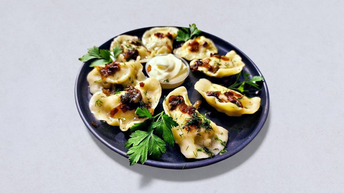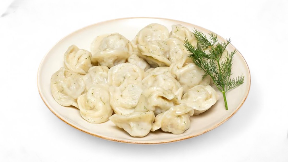 Duże pielmieni z wieprzowiną masłem, podawane z octem, masłem i śmietana, okrasa natka pietruszki