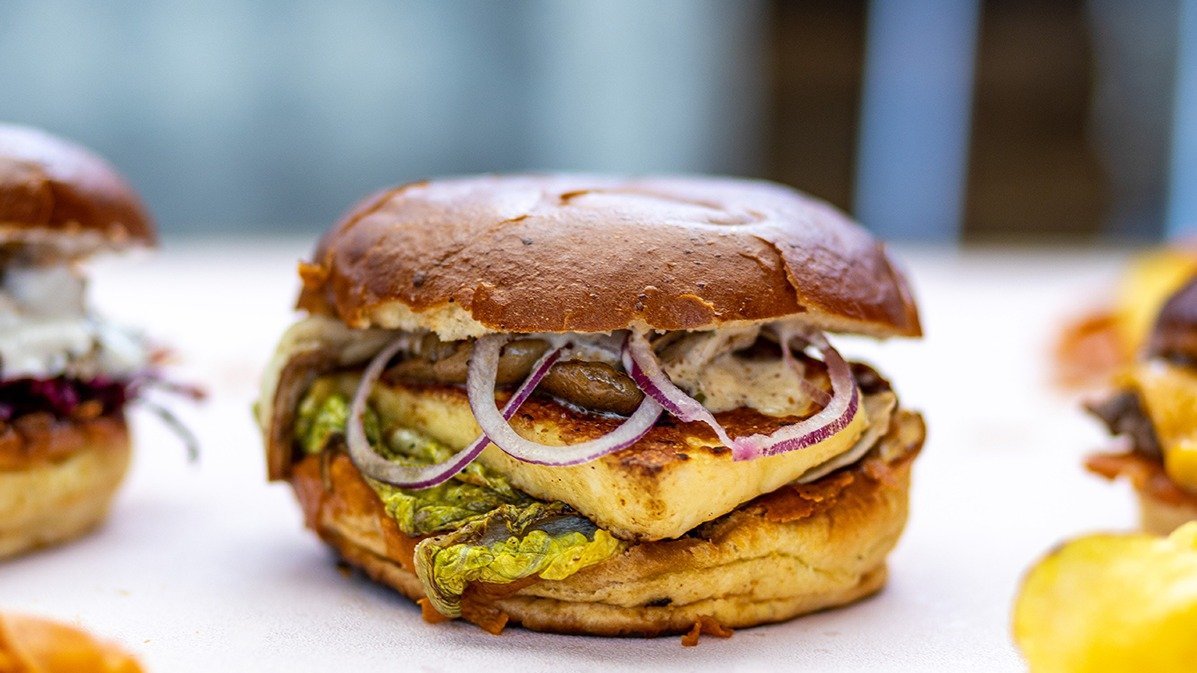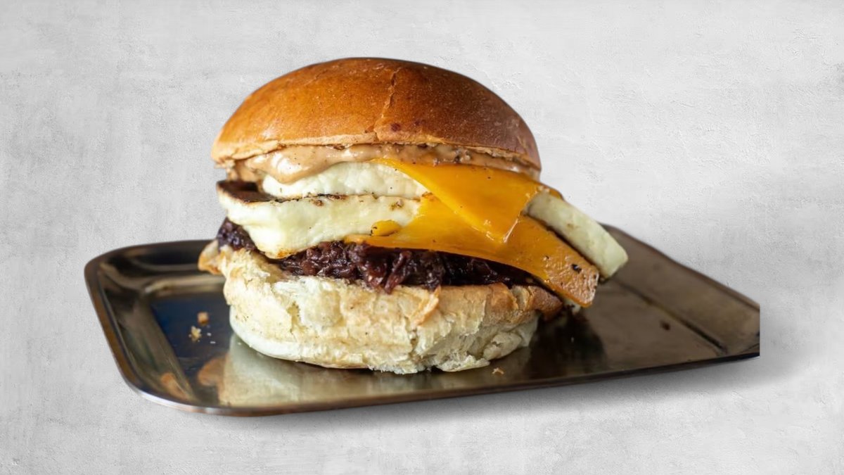ser halloumi, ser cheddar, bułka brioche, konfitura z czerwonej cebuli i jeżyny, homemade majonez BBQ chipotle, intensywnie ostry sos, ragout warzywne (bakłażan, marchewka, czerwona cebula, pomidor)