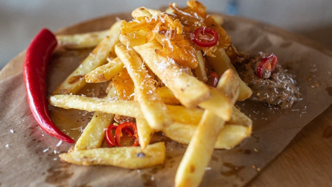 frytki + sos serowy / sos ostry, homemade majonez BBQ/chipotle, ser grana padano + sos salsa verde (kurkuma, imbir, chili, pepperoni, miód, oliwa, limonka, bazylia, mięta, kolendra, pietruszka)