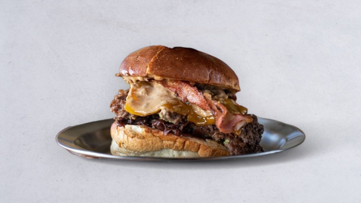 wołowina, bekon, ser cheddar, bułka brioche, konfitura z czerwonej cebuli i jeżyny i śliwki, majonez bbq-chipotle, intensywnie ostry sos, ragout warzywne (bakłażan, marchewka, czerwona cebula, pomidor)