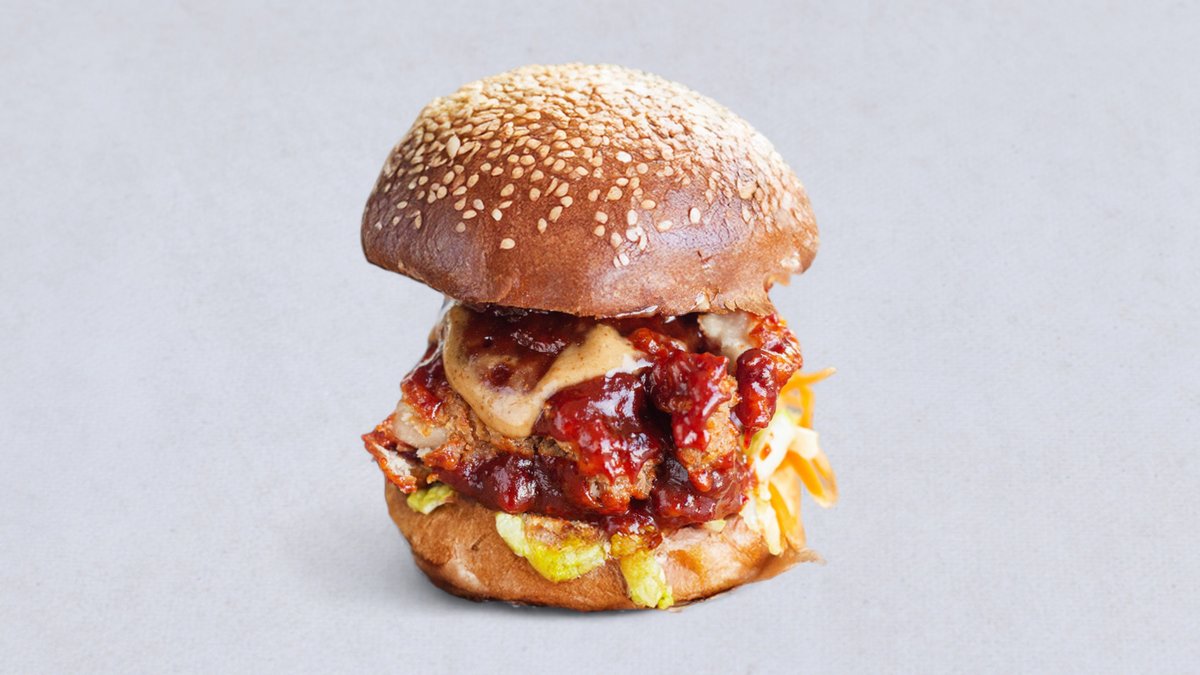 kurczak smażony w tempurze (podudzie kury), bułka brioche, coleslaw z kiełkami mung, sos pikantno-słodki (gochujang, olej sezamowy, miód, imbir, czosnek)
