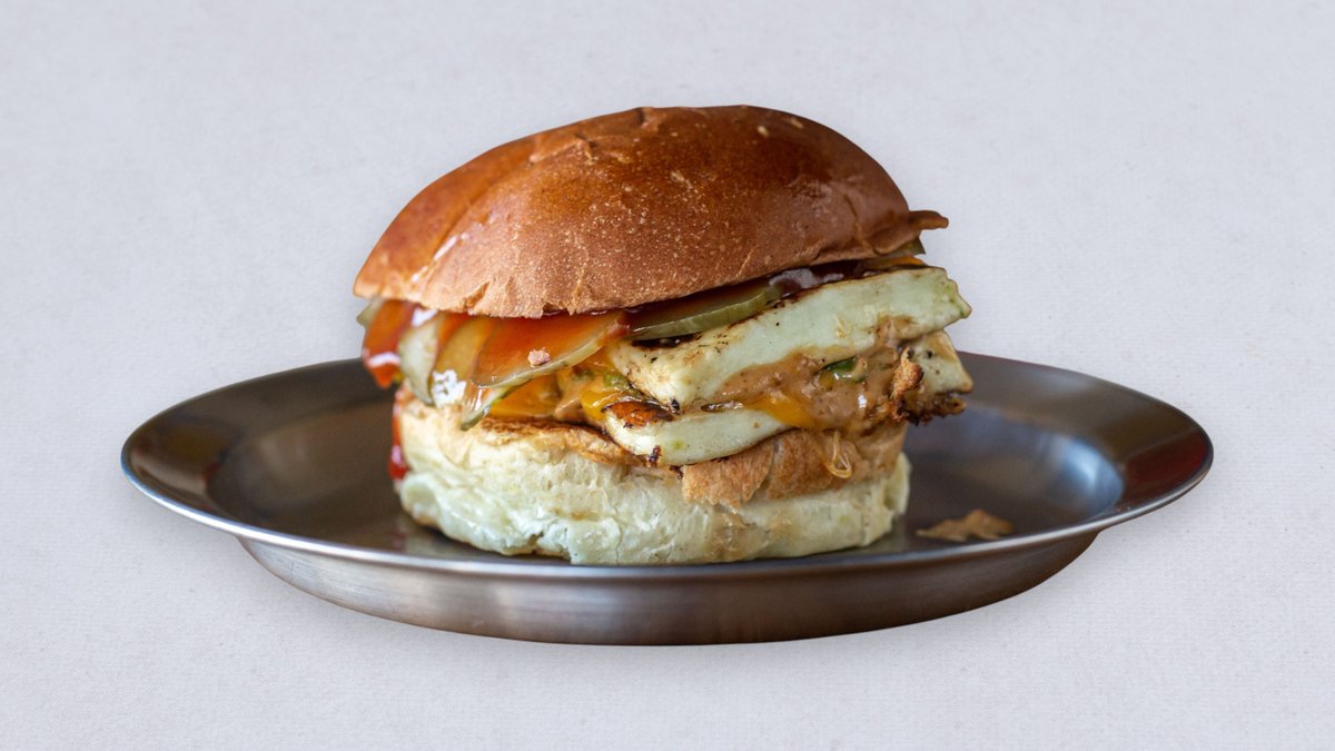 ser halloumi, ser cheddar, ekologiczne jajko sadzone, bułka brioche, ogórek kiszony, sałata, homemade majonez (musztarda dijon, miód)
