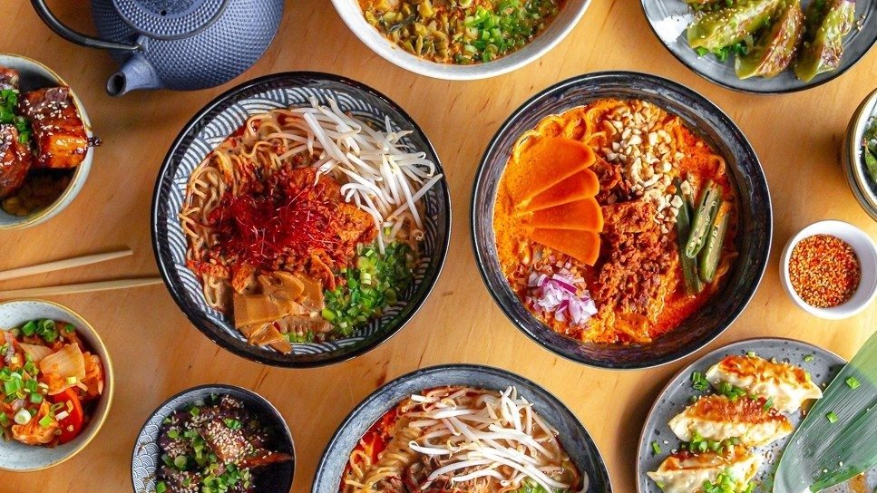 Ramen bar oferujący kremowe, klarowne lub lekkie, wegańskie rameny oraz loaded fries z dodatkami.