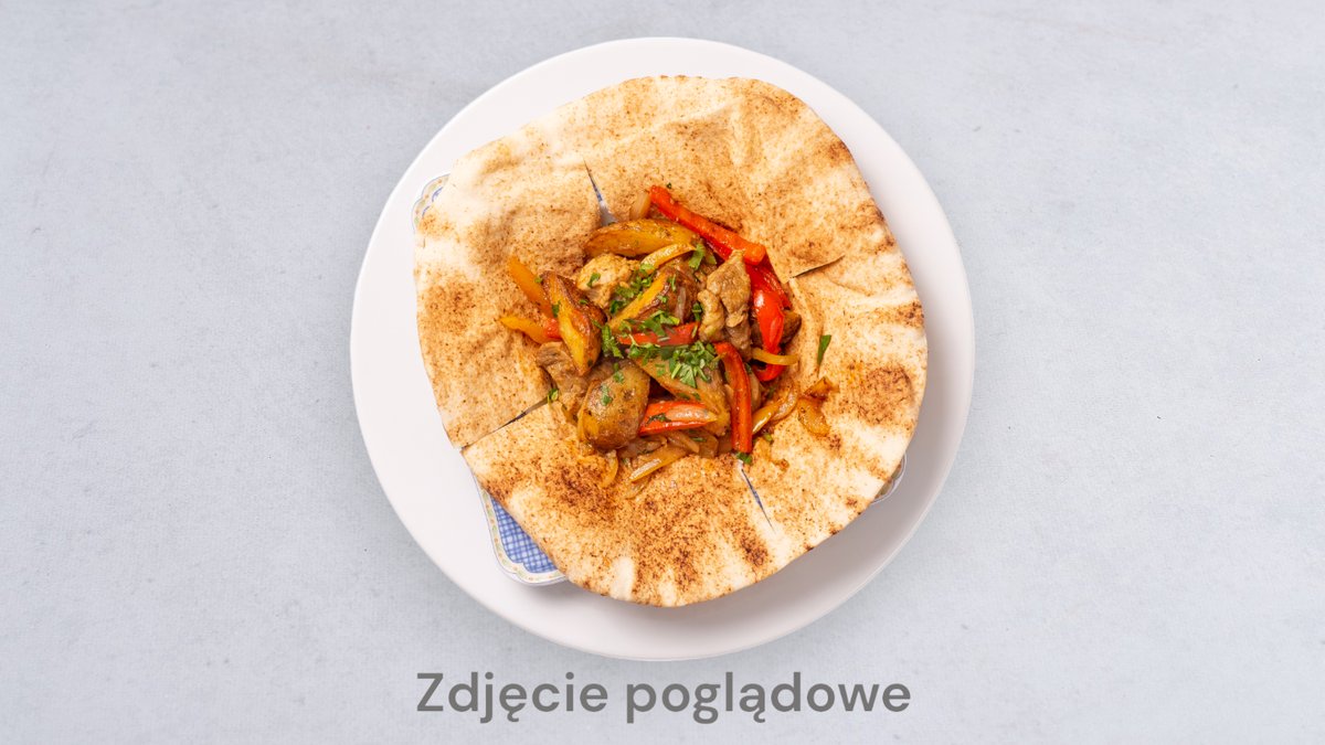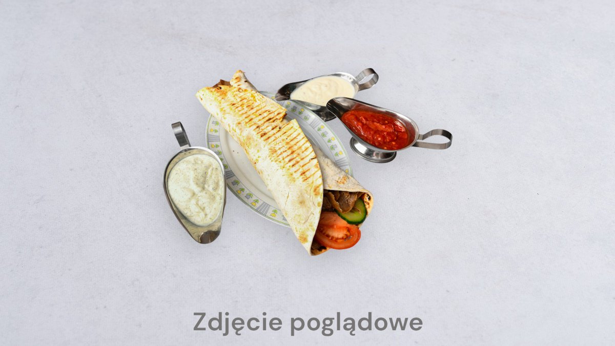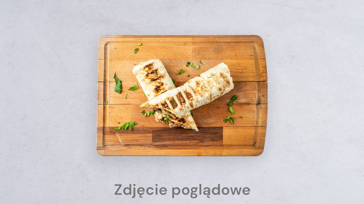 Grillowane mięso z pomidorem, serem i sałatą zawinięte w lawasz