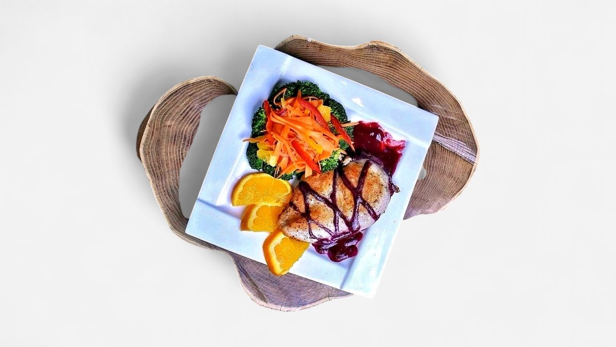 pierś z kurczaka w sosie z czerwonego wina i jerzyn z dodatkiem brokuła i marchewki w cytrusowym sosie