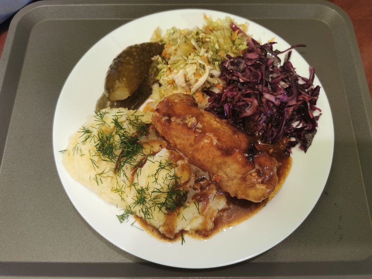Zraz ze schabu,ogórek,papryka,pieczarka w sosie pieczeniowym