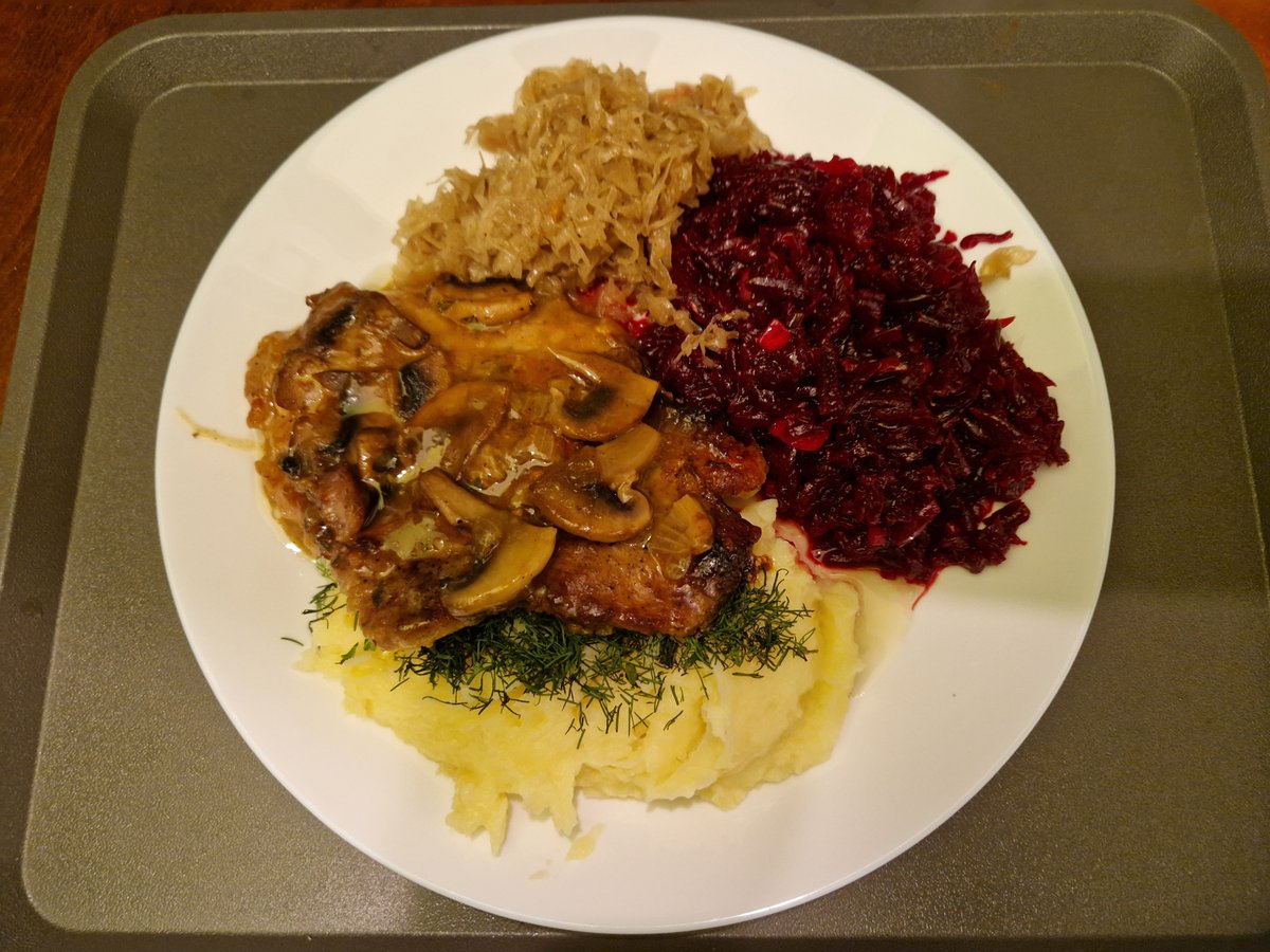 Schab pieczony w sosie pieczarkowym + zupa BARSZCZ BIAŁY Z JAJKIEM