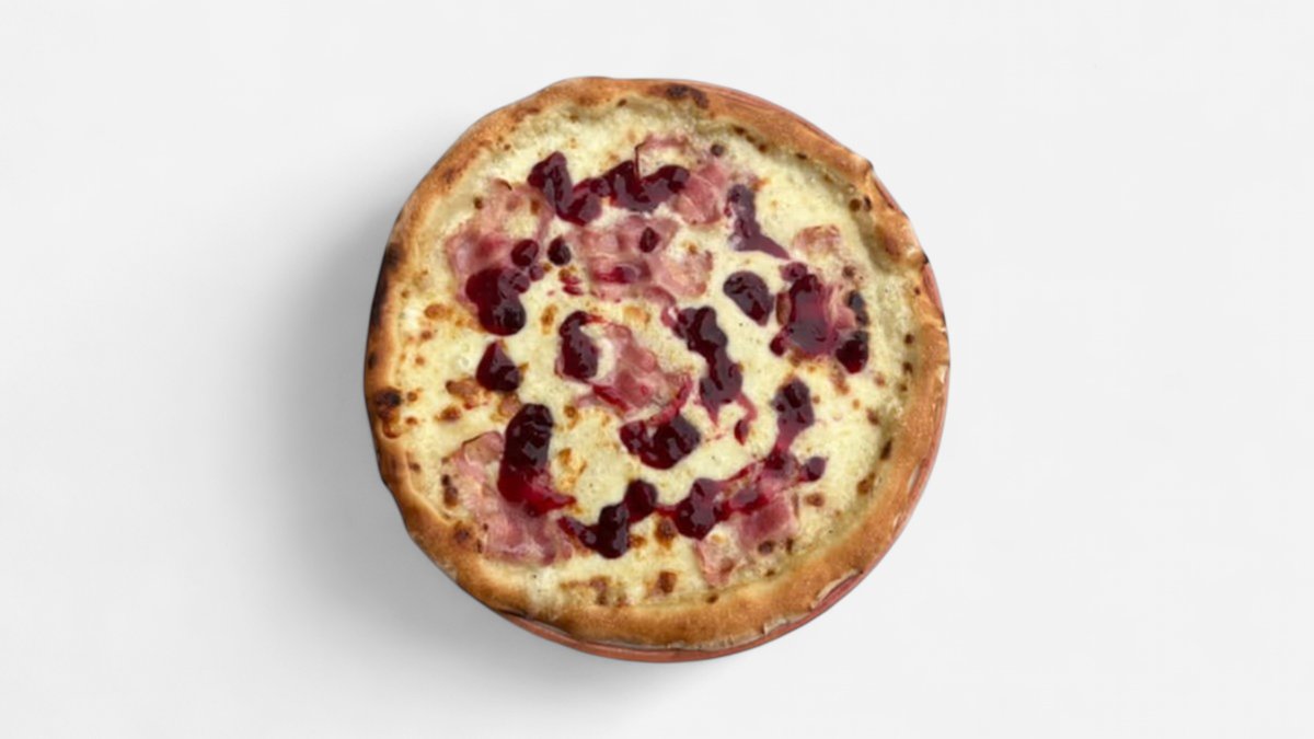 sos śmietanowy, mozzarella fior di latte, scamorza, boczek, żurawina
