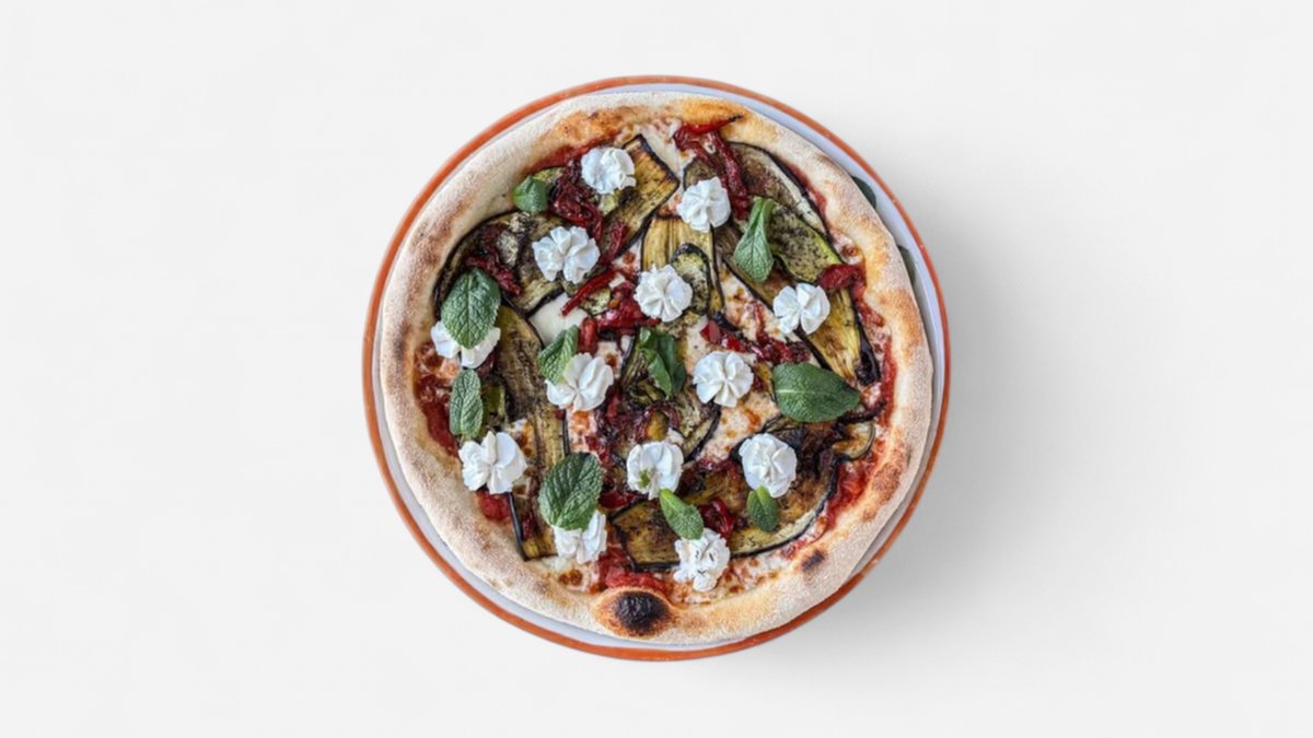 sos pomidorowy, mozarella fior di latte, grillowany bakłażan, grillowana cukinia, grillowana papryka, ricotta, mięta