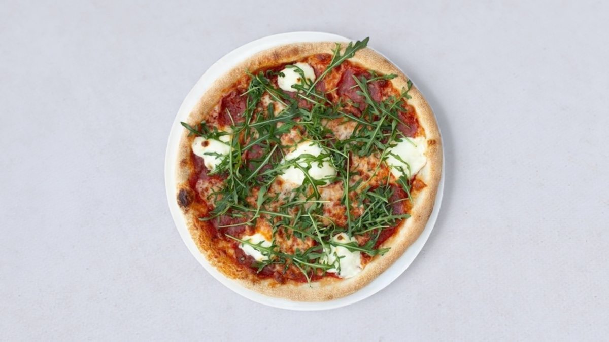 Pomidory pelati, mozzarella fior di latte, salami napoli, mascarpone, rukola