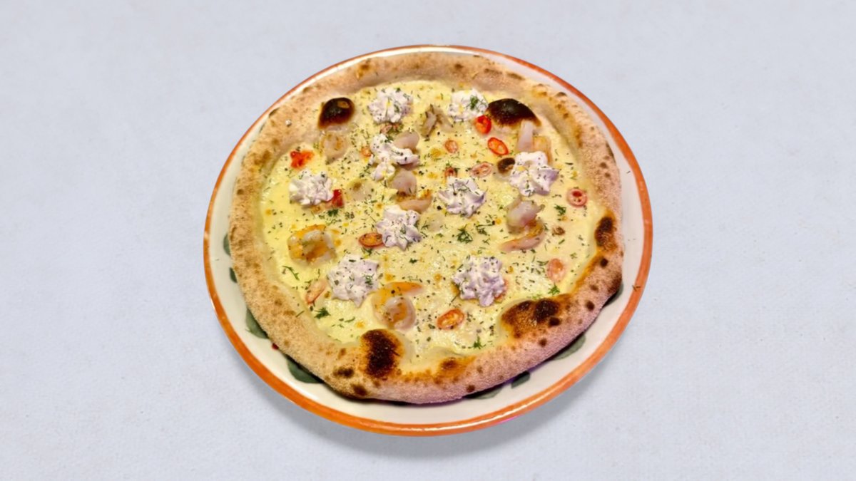 sos śmietanowy, mozzarella fior di latte, krewetki (6szt), cytrynowa ricotta, pepperoni, koperek, zest z cytryny