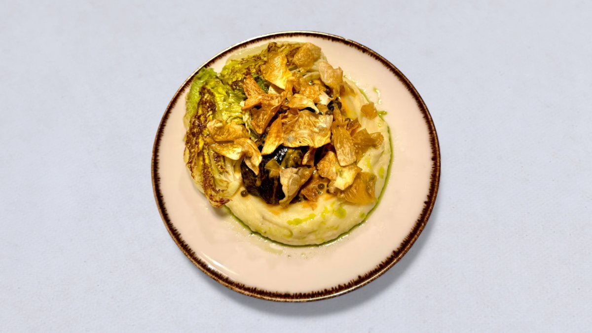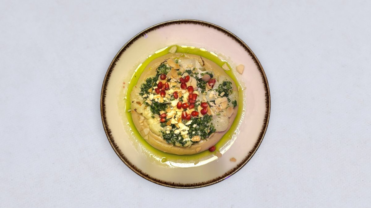 stek z kalafiora, puree selerowo-orzechowe, gremolata, prażony migdał, granat, oliwa ziołowa