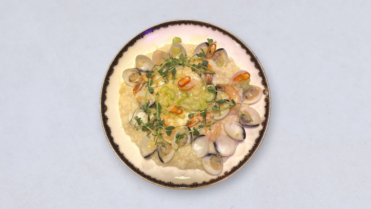 risotto, krewetki (5szt), vongole (10szt), sos winno-maślany, cebula, seler naciowy, pepperoni